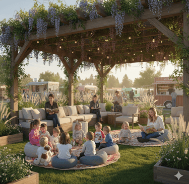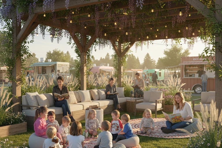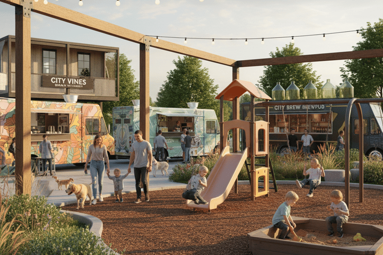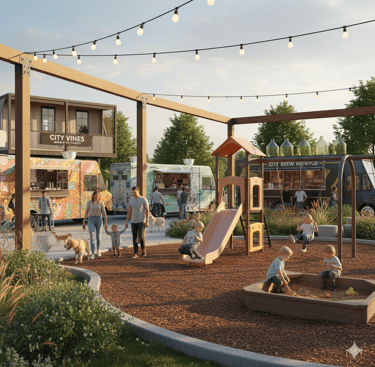 A Festive Food Truck Hub and Communal gathering park: Permanent electric hookups will accommodate 8-12 curated local food trucks, and/or complimentary vendors, providing a diverse range of high-quality, affordable dining options for lunch and dinner.